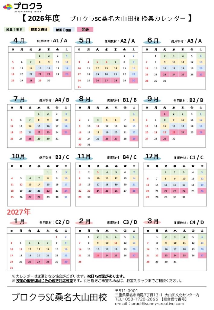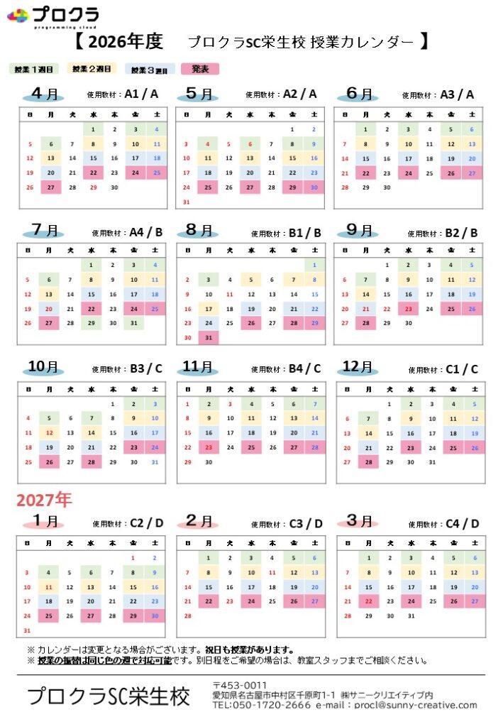 2025年4月~2026年3月までの授業カレンダーになります。